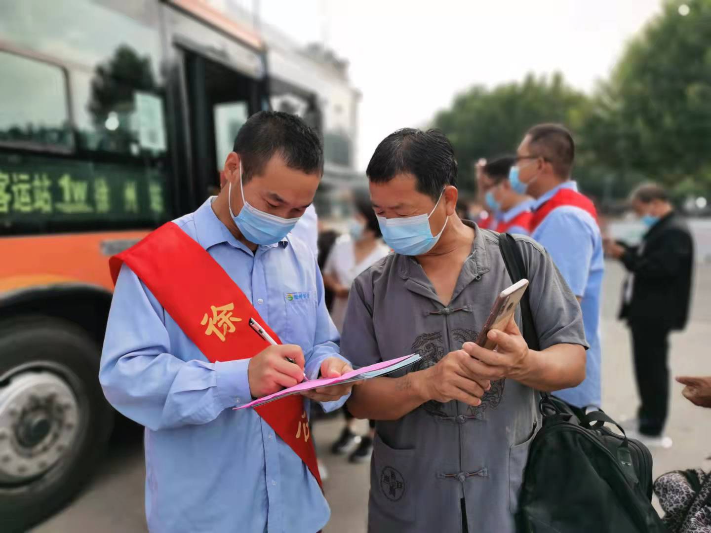 在活動現(xiàn)場,志愿者們積極行動,一邊引導車輛規(guī)范進站,一邊疏導乘客有序上下車,解答乘客提問,并幫助乘客調(diào)取“健康碼”及“行程碼”,方便市民乘車。