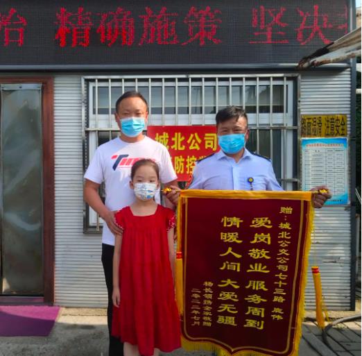 7月24日上午,市民張先生一家人專(zhuān)程來(lái)到楊山路調(diào)度室,將一面寫(xiě)有“愛(ài)崗敬業(yè)、服務(wù)周到、情暖人間、大愛(ài)無(wú)疆”字樣的錦旗送到73路駕駛員鹿偉的手中,感謝他幫助迷路的孩子找到家人。