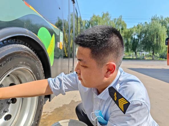 “衣服都濕透了,別弄了,先歇歇吧。”“沒事,我把衛(wèi)生弄好了就去?!?.....眼前這個小伙是603路的張?zhí)祧?,趁著休停時間,他一邊用布擦拭著輪轂,一邊用手擦拭臉上的汗珠。忙完后,發(fā)現(xiàn)發(fā)車時間已到,他立即回到駕駛室,等待乘客的到來和發(fā)班指令,沒來得及喝上一口水。