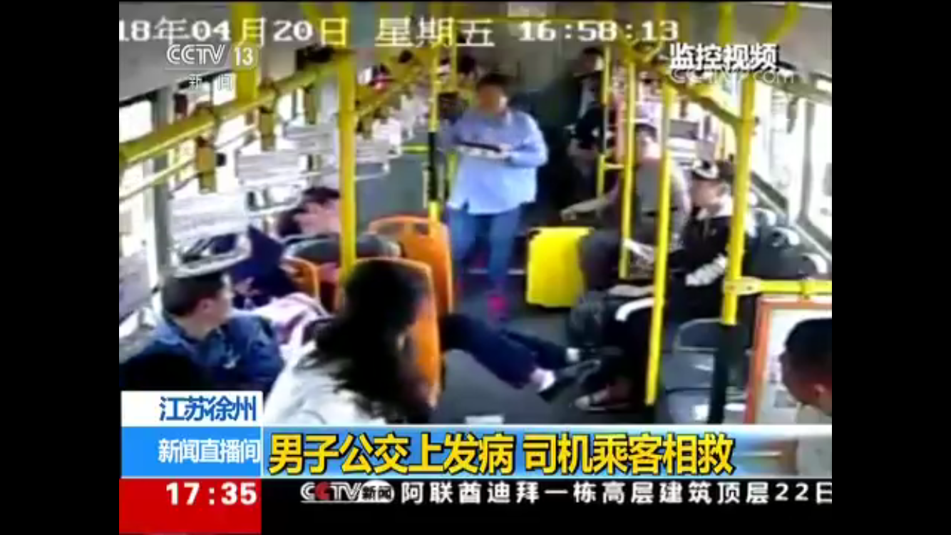 4月20日下午4點(diǎn)58分,26路自編號(hào)5025車從徐州開往賈汪途中,一名坐在車中間座位上的男乘客突然倒在了旁邊乘客身上,口吐白沫,渾身抽搐打著哆嗦,情況十分危急。乘務(wù)員昝昱安和周圍乘客立即上前查看,駕駛員耿德志也急忙停下車趕來(lái)。