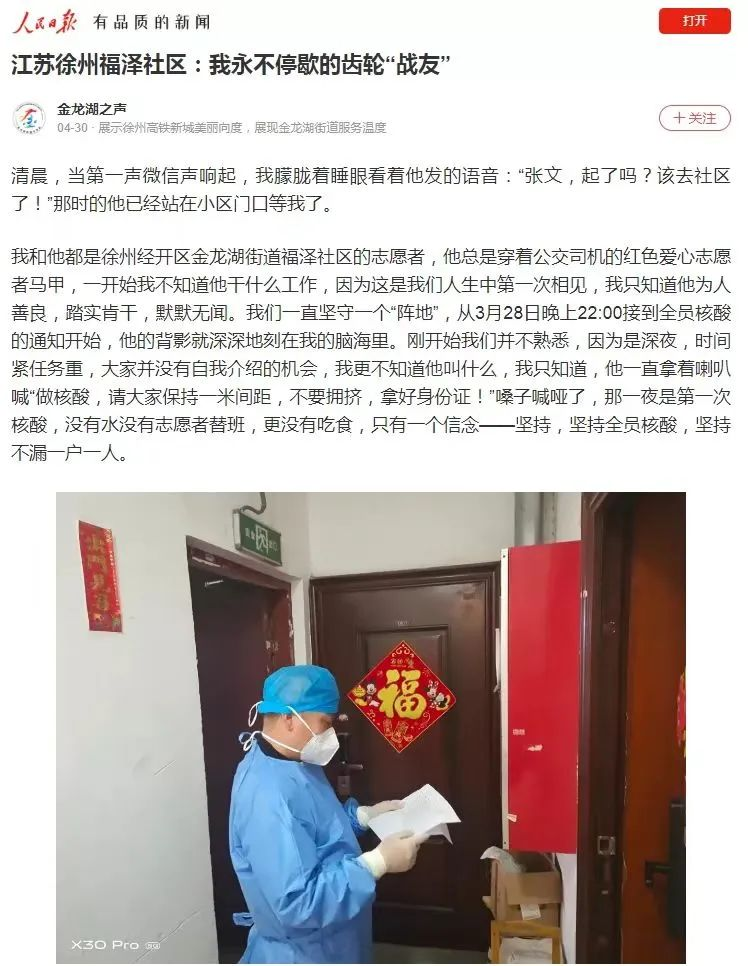 今年3月底,疫情在徐州蔓延,徐州公交停運。鹿偉積極響應(yīng)號召,在經(jīng)開區(qū)金龍湖街道福澤社區(qū)做起了防疫志愿者,測溫、登記、消毒,只要是需要的地方都可以看到他忙碌的身影。在全員核酸檢測的進程中,福澤社區(qū)部分工作人員因接觸密接人員而被隔離,志愿者便擔(dān)負起各個核酸點位的工作。從那時起,鹿偉便總是早晨第一個來,晚上最后一個走。全員核酸一輪接一輪,不管安排什么工作,他每天都如約而至,從不遲到,從不停歇。而他口中永遠都只有一句話:“只要沒開工,我就天天干,開工了我就要上班去。”多么淳樸的一句話,簡潔明了,可是,卻無不透露著他內(nèi)心深處的干凈、純粹、無私、大愛、無怨無悔。很多人會問他為什么這么堅持不懈,是什么讓他這樣干勁十足,他的回答一直都是:“我喜歡付出,我覺得這樣活得很踏實、很充實,家里人也很支持我。”