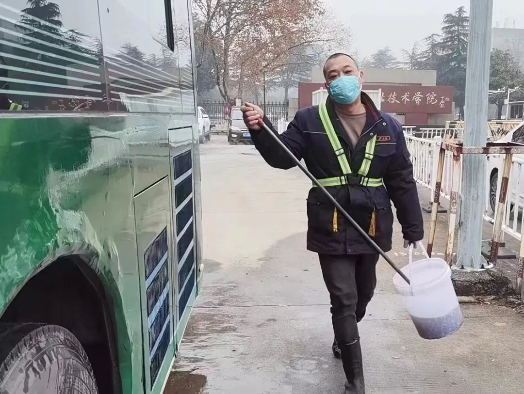 春運期間,為保障廣大市民乘客出行需求,部分公交線路縮短了發(fā)車時間,增加了運營車輛,再加上客流增多,路面擁堵等情況,公交車回到終點站停放的時間很短,又要投入到下一趟的運營當(dāng)中,這無疑給車輛保潔工作帶來了一定的困難。因此,為確保出場車輛干凈整潔,每天天沒亮,張璞已經(jīng)在建筑學(xué)院停車場里忙起來了。只見他一手拿毛刷,一手拎水桶,開始清潔車廂外部,張璞動作嫻熟地擦拭前擋風(fēng)玻璃、車廂外部兩側(cè),不一會,他的臉上就已掛滿了汗珠,平均一輛車10分鐘的清潔時間,是他十多年工作鍛煉出來的速度。近日氣溫驟降,持續(xù)有冰凍天氣,如果抹布太濕,早晨擦座椅時會粘在上面,為此張璞都會提前準(zhǔn)備好潮濕的抹布,既能擦掉扶手、座椅、靠背上的浮塵,還不會留下水漬。像這樣日復(fù)一日的簡單工作,張璞堅持了十多年,他平均每天要打掃23臺車,平均一輛車10分鐘的清潔時間,張璞用自己的勞動,換來了車輛的干凈整潔。