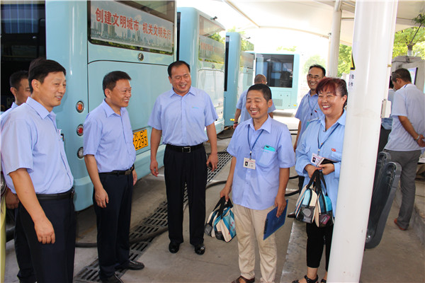 炎炎烈日下,空調(diào)公交車成為市民出行首選。為給市民營造舒適、涼爽的乘車環(huán)境,各運營公司應(yīng)用公交GPS智能調(diào)度系統(tǒng),科學(xué)調(diào)度、靈活排班、保證運力充足。同時,結(jié)合創(chuàng)建工作,提高服務(wù)質(zhì)量,全市2100多輛空調(diào)車全部開足冷氣;駕乘人員揮汗如雨堅持“一趟一清掃”,認真做好車輛清潔工作;督導(dǎo)隊員冒著高溫在各大站臺維持秩序、扶老攜幼、做好導(dǎo)乘服務(wù)、嚴(yán)查易燃易爆及危險品。由于各項舉措落實到位,確保了高溫期間全市161條公交線路運營順暢,乘客走好走了。(圖為董事長、總經(jīng)理杜紅軍,總經(jīng)理助理李修超一行在食品城充電站慰問堅守崗位的充電員工。)